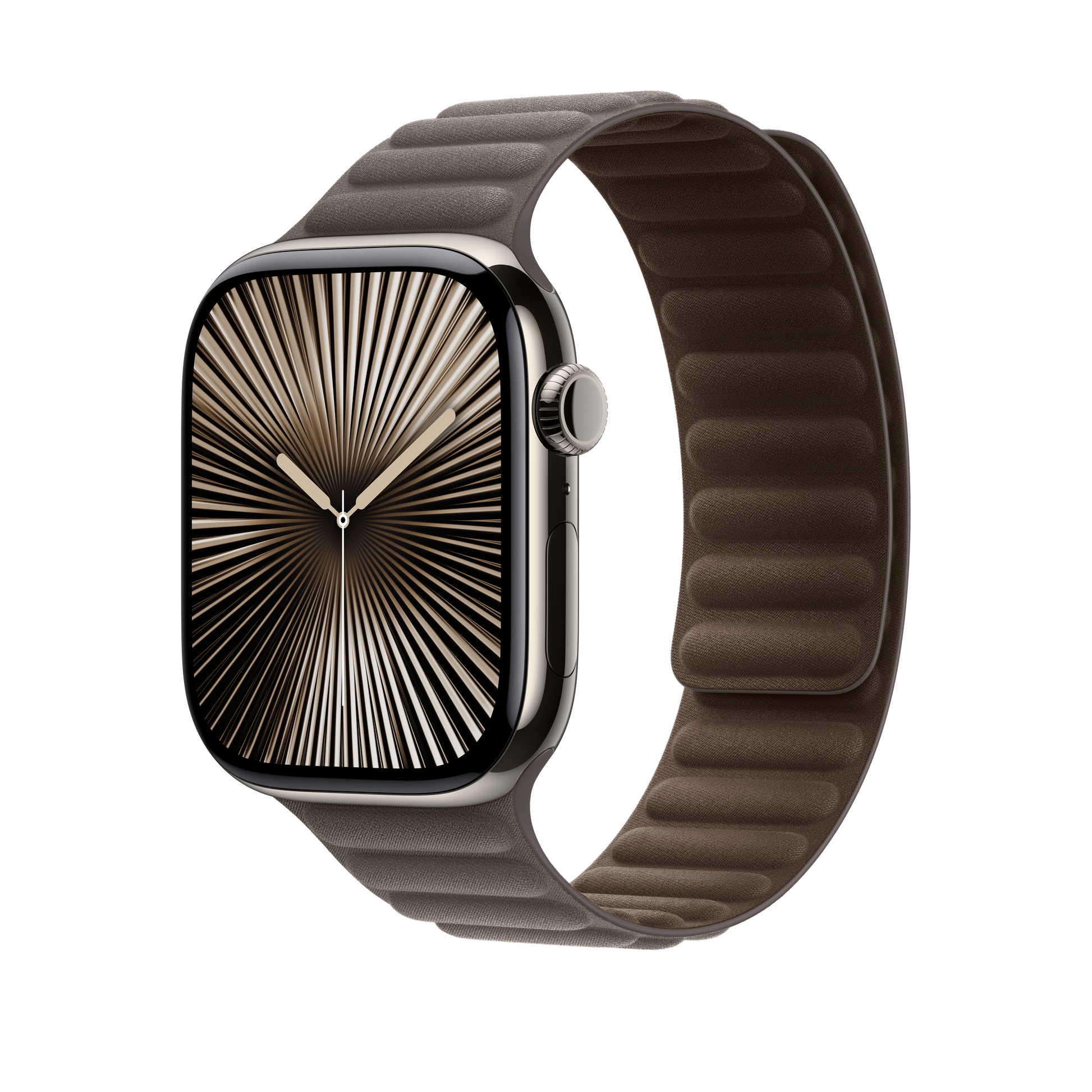 The Magnetic Link with FineWoven elegantly wraps around the wrist and magically attaches with moulded magnets that gently flex to help maintain security and comfort throughout the day. Made from a durable micro-twill, the FineWoven material has a soft, suede-like feel. It was also designed with the earth in mind — made from 68% post-consumer recycled content and significantly reducing carbon emissions compared to leather.