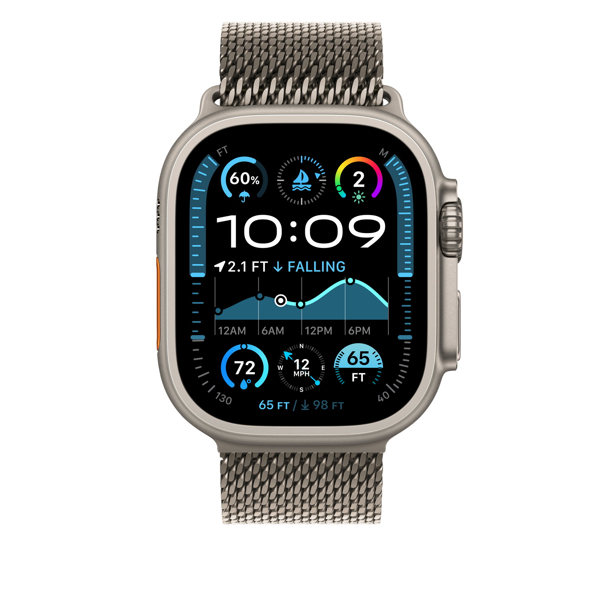 The Titanium Milanese Loop features aerospace-grade titanium mesh with a secure parachute-style buckle. Inspired by stainless steel mesh historically used by divers and designed for ocean activities. Made of lightweight titanium, it’s perfect for any occasion. This strap is carbon neutral. The Titanium Milanese Loop contains 85% recycled content by weight, 100% of manufacturing electricity is covered by clean energy, and 50% or more of all carbon-neutral Apple Watch products are shipped by air.