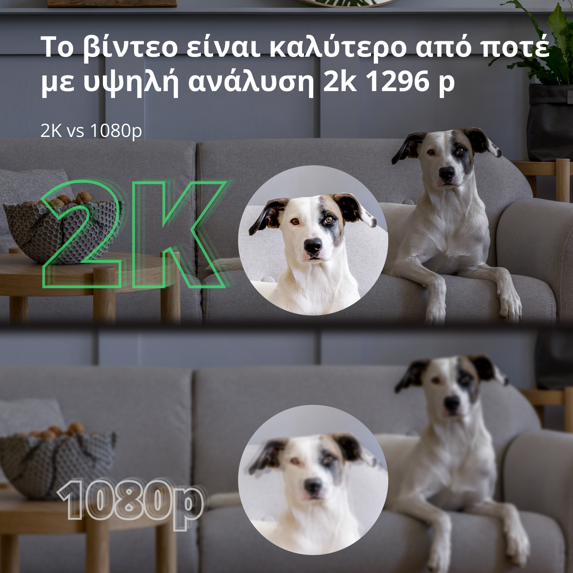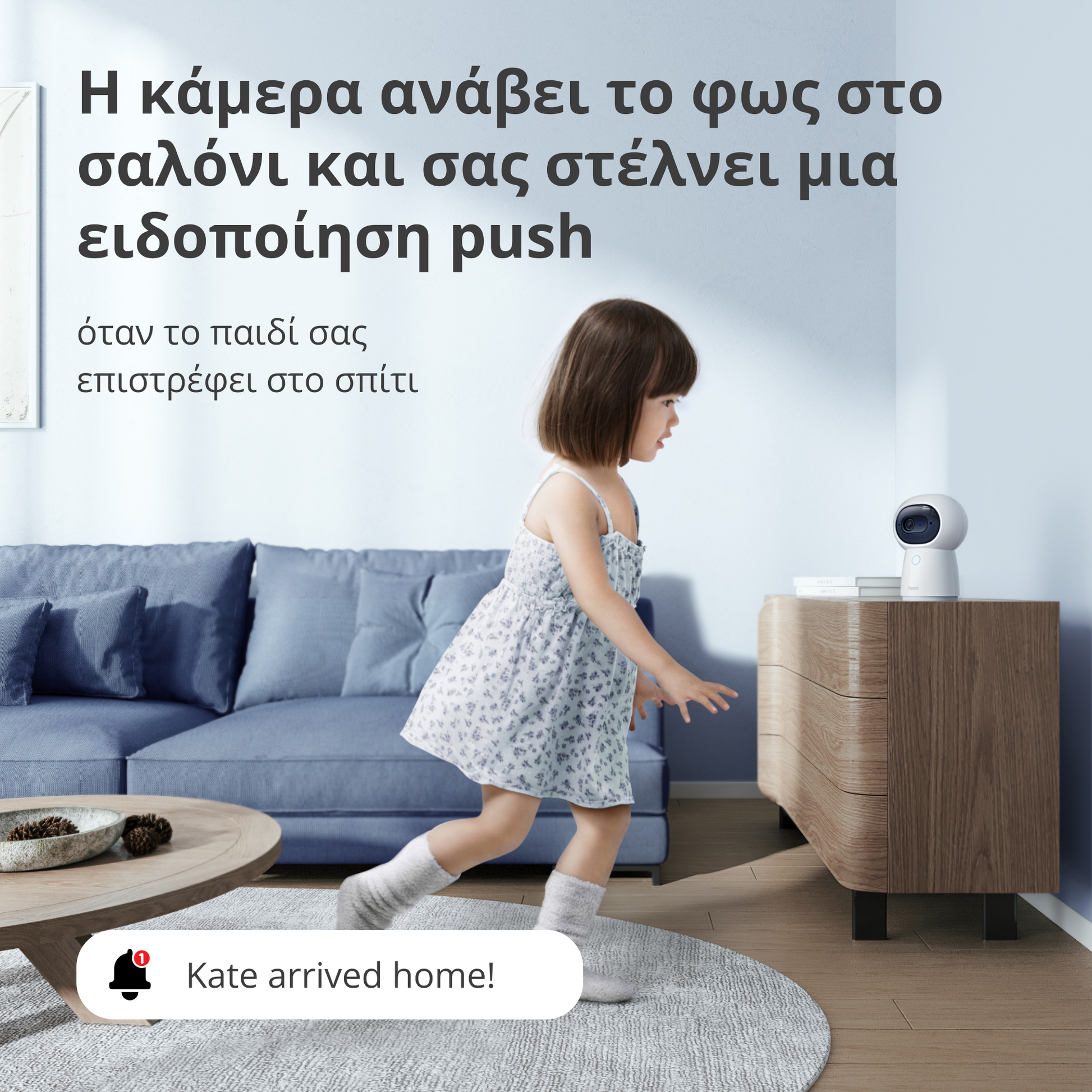 Γωνία Θέασης 360° μέσω Pan και Tilt: Ο ευρυγώνιος φακός 110° σε συνδυασμό με τους κινητήρες Pan και Tilt παρέχει γωνία περιστροφής έως 340°, υποστηρίζει αυτόματη περιήγηση και παρακολούθηση προσώπων και κατοικίδιων.
