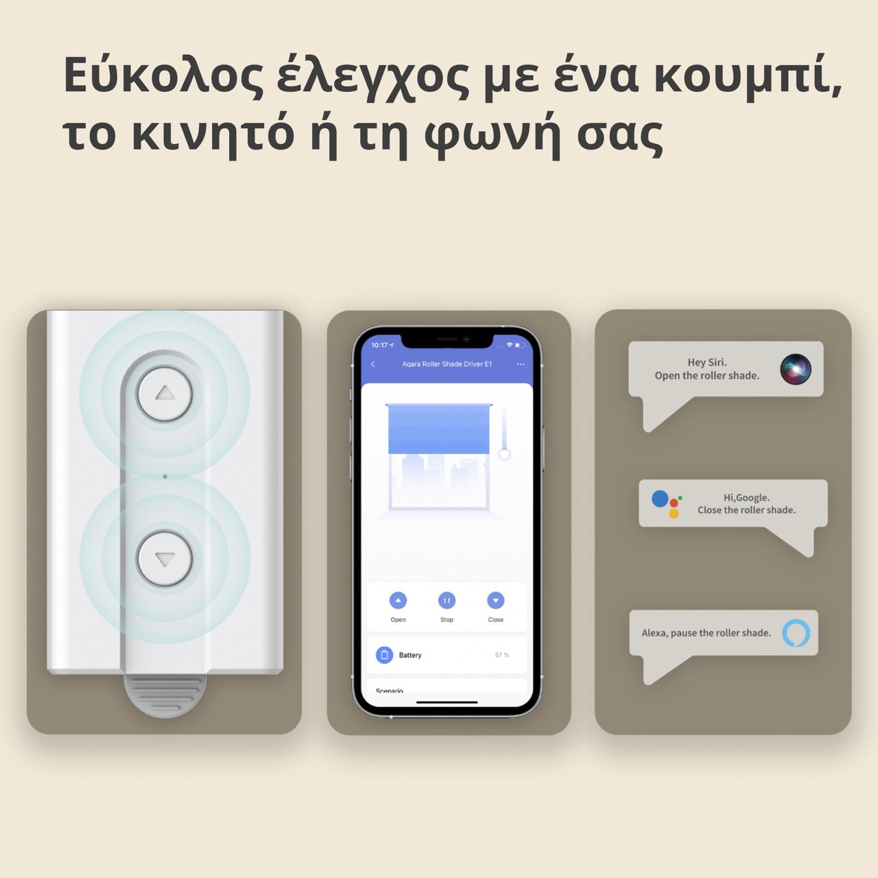 - Έλεγχος με Ένα Κουμπί: Χάρη στην εφαρμογή Aqara Home (iOS/Android), η πλήρης λειτουργία της ρολοκουρτίνας σας μπορεί να πραγματοποιηθεί με το πάτημα μόνο ενός κουμπιού, όπως το Aqara Mini Switch.